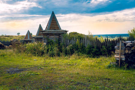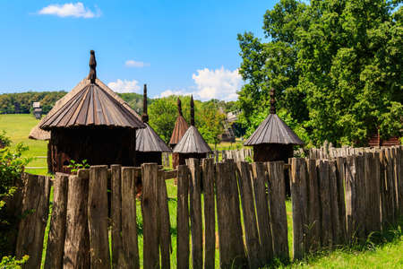 Authentic traditional culture in architecture and life. Old wooden buildings and rural fence in summer day.