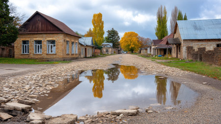 This captivating image captures a tranquil street in an abandoned village, featuring colorful autumn trees and a reflective puddle under a dynamic sky.