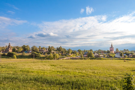 Rural landscape, field, houses and Church into the distance, Suzdal, Golden Ring, Russia