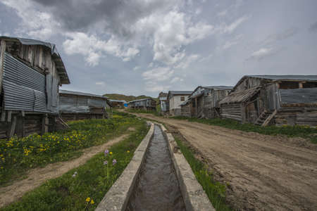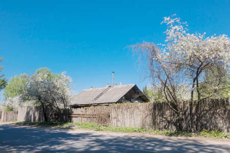 street of a small village old houses dirty road fences out of planks with blossomed paint.