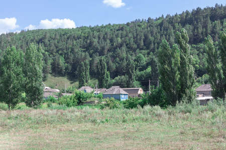 The nature of Russia. Small village in Kaluga region, several houses, green field and mixed forest. Pine and spruce trees grow next to houses. Blue sky with clouds.