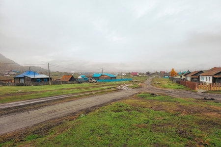 Real rural life in a remote area of Altai. Rural road washed out by rains. Autumn dirt road, impassable mud through the village.