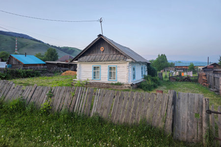 Old rustic wooden house behind the fence. Courtyard, modest lifestyle, simple real life. Rural evening landscape. Ust-Koksa village in Altai Republic, Russia.