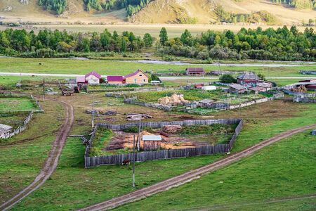 Livestock farm in the village, top view. Russia, mountain Altai, Ongudaysky district, the village of Bichiktu-Boom