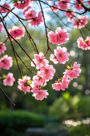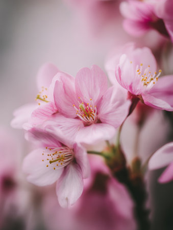 Cherry blossoms showcase delicate pink petals and bright yellow stamens amid gentle sunlight, symbolizing the beauty of spring and renewal.