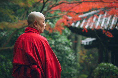 Tranquil buddhist monk cloaked in a vibrant red robe meditates in a lush, autumnal garden