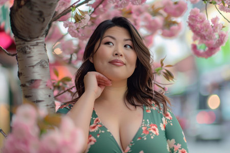Asian fat beauty in a green dress, under a cherry blossom tree.