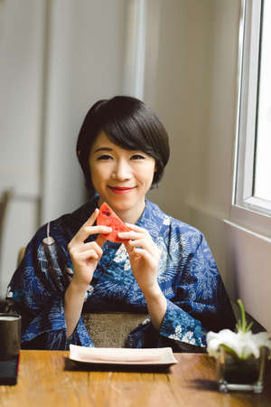 Beautiful smiling young Japanese woman eating watermelon