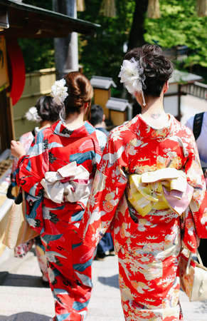 Women wearing traditional japanese kimonos walk along one of the streets in Kyoto, Japan.