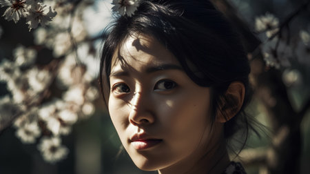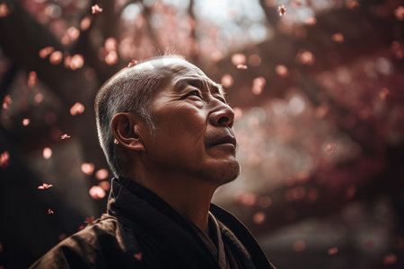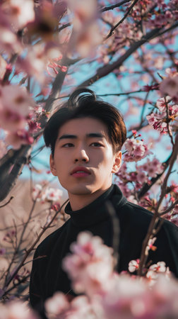 Portrait of Chinese man in cherry blossom, AI generated