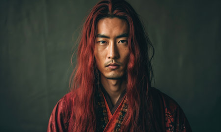 Portrait of young Asian man with deep red long hair in traditional clothes looking at camera