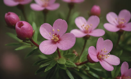 A cluster of small, vibrant pink flowers with yellow centers, set against a dreamy, blurred background of greens and purples.