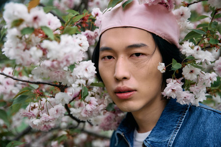 A young Asian man in a stylish denim outfit enjoys nature and vibrant flowers in the park.