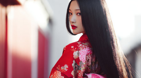 A graceful woman wearing a striking red kimono stands outdoors her long black hair flowing elegantly. The warm glow of sunset highlights her serene expression and detailed attire.