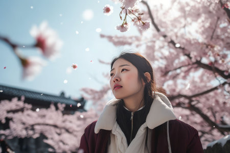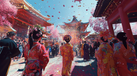Experience a vibrant celebration during spring, with participants in colorful traditional garments walking through a stunning setting filled with cherry blossoms and festive decorations.
