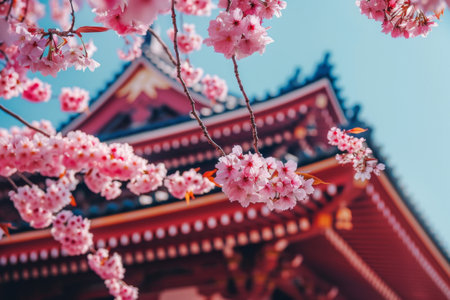 Delicate cherry blossoms hang gracefully on branches, framing a traditional structure adorned with vibrant colors against a flawless blue sky, showing the beauty of springtime in bloom.