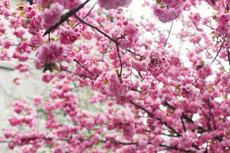 Beautiful blooming sakura branches in sunny light. Pink sakura flowers on tree in spring park. Enjoying spring in the city. Beautiful japanese cherry blossoms