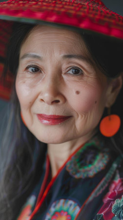 A close-up portrait of a woman wearing a traditional red hat. The womans face is turned slightly to the side, and she has a gentle smile on her lips. Her eyes are looking directly at the viewer, and she is wearing a dark blue and red garment with floral designs.