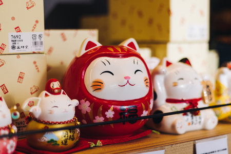 Traditional Japanese tourist souvenirs and gifts from Kyoto, Kansai, Japan, with daruma figures, kitsune fox, tengu mask, refrigerator magnets, toys figurines, key ring keychain, in a local vendor gift shop
