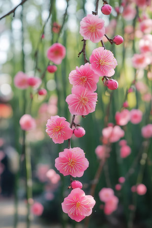 Blooming pink plum blossom flowers on branches against a blue sky in winter, Wuhan, China. Botanical close-up with shallow depth of field, vibrant color.