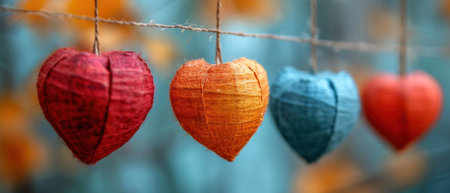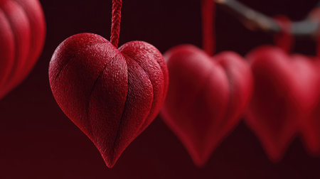 This image features elegant red fabric hearts beautifully hanging against a dark background, evoking feelings of love and romance, perfect for various celebrations.