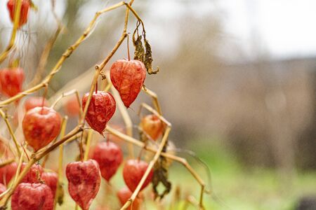 Red physalis alkekengi close-up. Exotic fruit on branch. Chinese lantern, Japanese lantern, ground berry. Authentic farm product. Medical plant for treatment of various diseases.