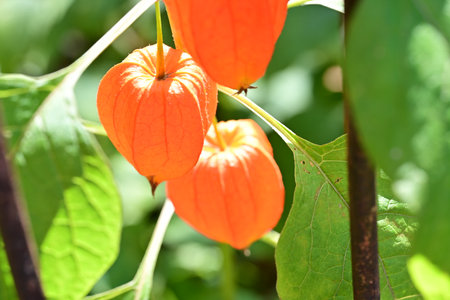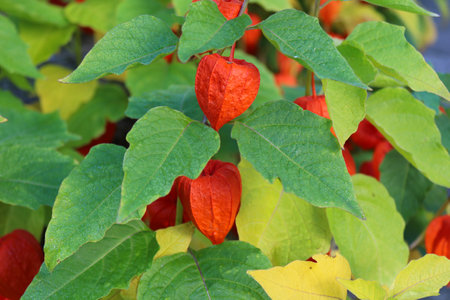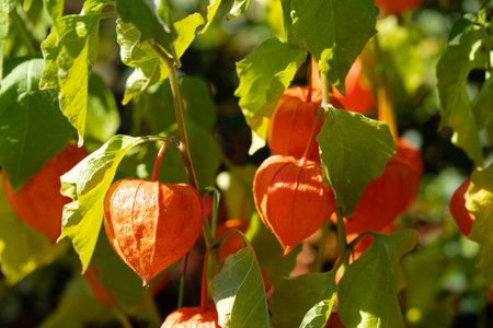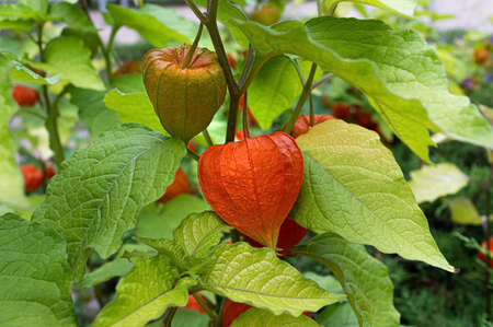 Physalis - orange lanterns of physalis alkekengi among green leaves
