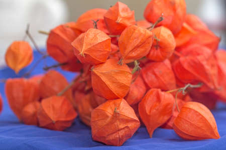 Autumn background. Bright orange physalis berries on a blue woody background. Background for the autumn holidays and thanksgiving day.