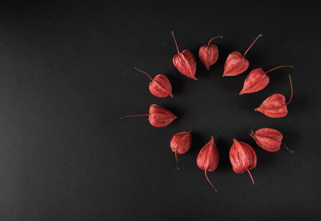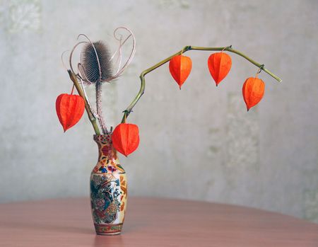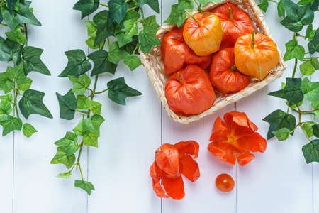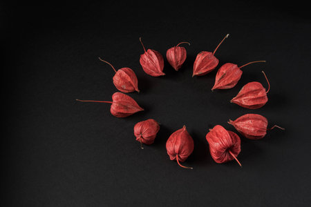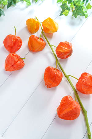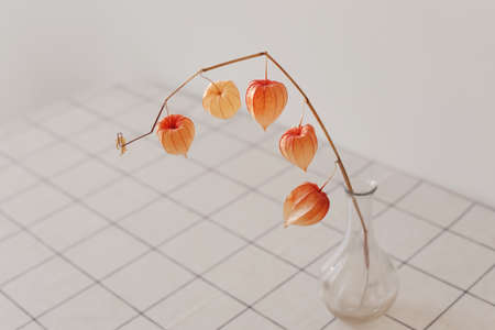 Physalis Alkekengi plant. Chinese lantern or ground berry. Authentic home decor in minimalist style.