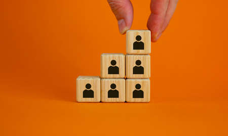 Business executive stacking wooden cubes with people icons on them in a pyramid shape in a conceptual image. Beautiful orange background, copy space. Business concept.