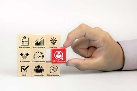 Human resource management and recruitment business concept, Hand holding wooden cube block with word HR