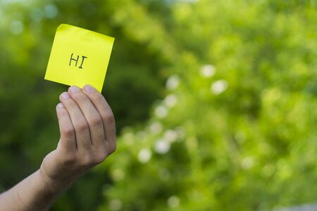 Sticker with the inscription: HI in the male hand, life style. Toned