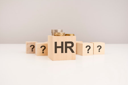 hr concept. wooden block with hr - HUMAN RESOURCE MANAGEMENT - symbol and coins on gray background