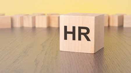 a wooden cube with a text HR rests on the brown table, against a yellow background. copy space