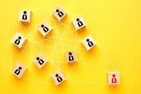 Connecting icon people wooden cube block for social media networking. Organization structure, social network, leadership, team building.