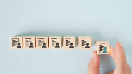 businessman's hand choose the difference person icon on wooden cube blocks on pastel blue background, for customer persona, human resource concept