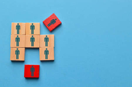 Top view wooden blocks with people icon on blue background. Concept for company and human resorce manangement.