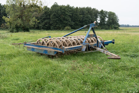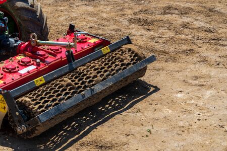 Detailed view of agricultural machinery showing precision engineering, metal rollers and industrial design for soil cultivation. Durability, innovation, technology and mechanical efficiency