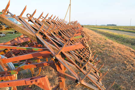 Tine harrow. Agricultural machinery and equipment. Parking farm machinery.