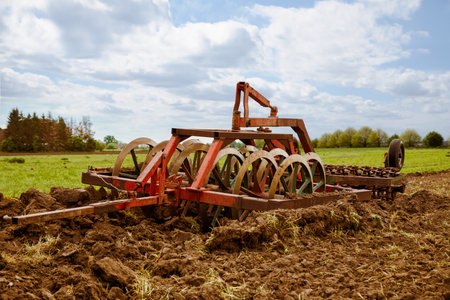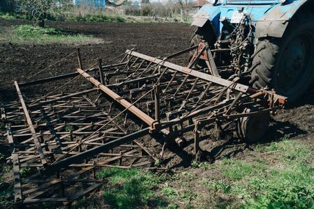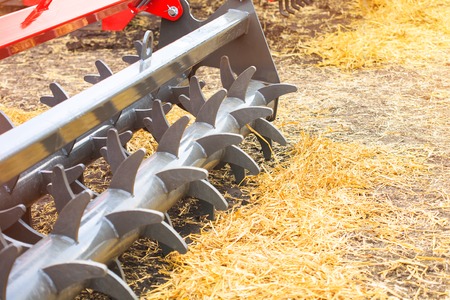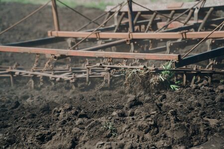 Agricultural cultivator close-up on the ground, farm equipment