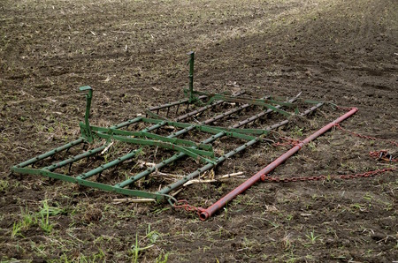 A drag in the field is used to dig up weeds and smoothing the soil for planting in the spring