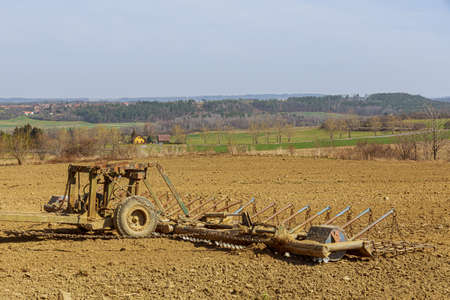 Harrows in the field will cultivate the land before sowing green manure. Mulching the ground after harvest.