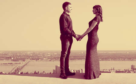 Happy couple walking through an amusement park. stylish guy and girl, models