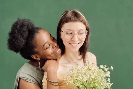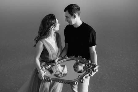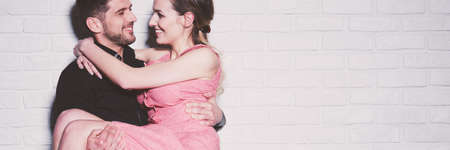 side view of smiling woman with bouquet and handsome man on pink and blue background
