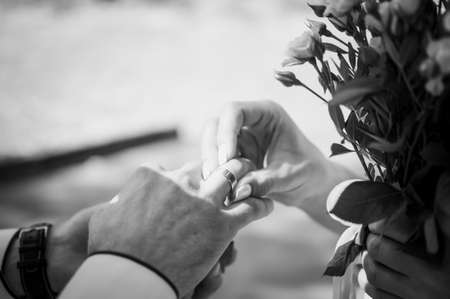 Groom puts wedding ring to the bride's hand at sunset near the sea