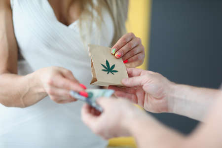 partial view of man passing drugs in plastic zipper bag to man in nightclub