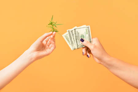 Sale payment concept. Cropped closeup photo of a bundle of money standing on palm of entrepreneur investment investor isolated grey background
