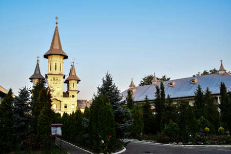 Curchi Monastery and beautiful outdoor garden view. The green park around the famous landmark in Orhei, Moldova. Christian Orthodox style church traditional for eastern Europe culture and religion