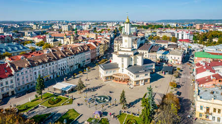 Ivano-Frankivsk, Ukraine - October 2021: Top view of the historic center of Ivano-Frankivsk, Ukraine.