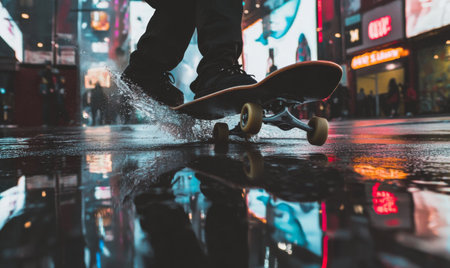 A skilled skater dances under city lights as rain-soaked pavement reflects colorful hues. The atmosphere buzzes with urban energy at dusk, creating a captivating moment of freedom and movement.